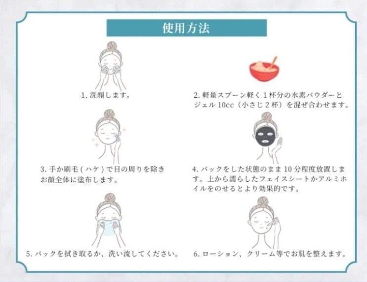 水素専門メーカーが20年の研究で作った水素パック。 今、話題の米粉・モリンガ・鹿角霊芝など、食品で作られた安心原料の美容ジェルに水素パウダーを混ぜて使います。 ・界面活性剤不使用 ・パラペン不使用 ・鉱物油不使用 ●鹿角霊芝・・・老化予防/美白効果 ●セラミド・・・保湿 ●モリンガ・・・乾燥/肌荒れ ●お米テクノロジー・・・くすみ・透明感